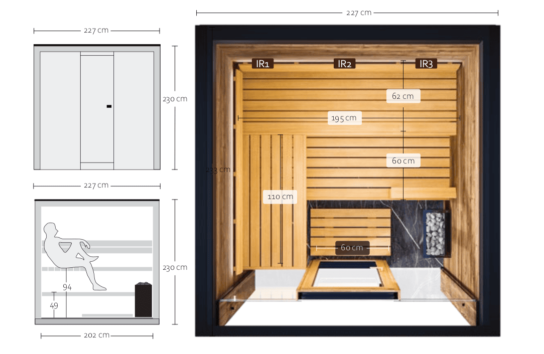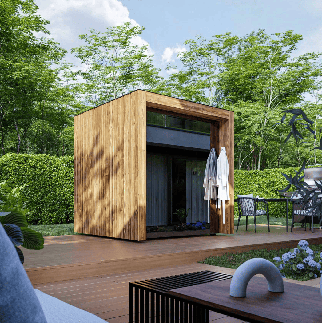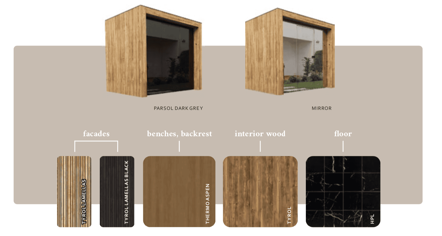 The Cute sauna comes in 4 different sizes, where the larger models include a separate lounging area, changing room and shower. Drop us a message for more info…